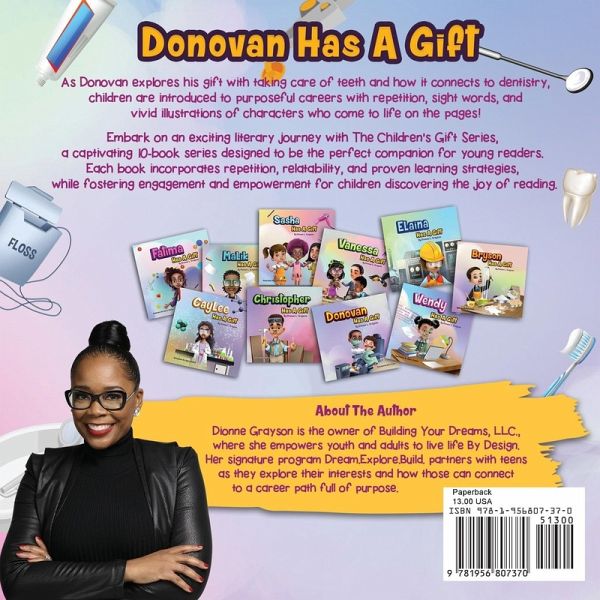 As Donovan explores his gift with taking care of teeth and how it connects to dentistry, children are introduced to purposeful careers with repetition, sight words, vivid illustrations of characters who come to life on the pages! Embark on an exciting literary journey with The Children Gift Series, a captivating 10-books series designed to be the perfect companion for young readers. Each book incorporates repetition, relatability, and proven learning strategies, while fostering engagement and empowerment for children discovering the joy of readings.