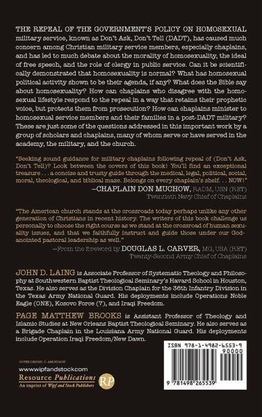 The repeal of the government's policy on homosexual military service, known as Don't Ask, Don't Tell (DADT), has caused much concern among Christian military service members, especially chaplains, and has led to much debate about the morality of homosexuality, the ideal of free speech, and the role of clergy in public service. Can it be scientifically demonstrated that homosexuality is normal? What has homosexual political activity shown to be their agenda, if any? What does the Bible say about homosexuality? How can chaplains who disagree with the homosexual lifestyle respond to the repeal in a way that retains their prophetic voice, but protects them from prosecution? How can chaplains minister to homosexual service members and their families in a post-DADT military? These are just some of the questions addressed in this important work by a group of scholars and chaplains, many of whom serve or have served in the academy, the military, and the church.