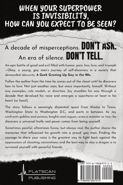 When your superpower is invisibility, how can you expect to be seen? ¿ A decade of misperceptions. Don't Ask. ¿ An era of silence. Don't Tell. ¿ An epic battle of good and evil filled with humor, pain, loss, love, and triumph - Okay, a young, gay man's journey of self-discovery in a society that demanded obscurity. A Geek Growing Up Gay in the 90s. Follow the author from the time he comes out of the closet until he discovers how to love. Not just another man, but more importantly, himself. Without any examples, role models, or direction, Jay stumbles his way through a decade that devalued his voice and emerges a superhero - at least in his heart (or head). The story follows a seemingly disjointed quest from Alaska to Texas, Washington State to Washington D.C., and parts in between. As Jay confronts goblins and princes, knights and rogues - even a monster or two - he discovers a universal truth; real power comes from being yourself. Sometimes painful, oftentimes funny, but always real, the author shares the memories that influenced his growth into a proud, gay man. Finding the courage to share your voice is the greatest way to fight back against the oppressions of closeting conventions, and the best way to slay a dragon is to surround yourself with powerful friends.