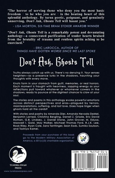 Truths always catch up with us. There's no denying it. Your senses heighten-as a presence lurks in the shadows, haunting your thoughts with every move. Knots form in your stomach from guilt, memories, or real horrors. Each moment is fraught with heaviness, zapping energy as your reflections pull toward whatever or whomever cowers in the shadows, ready to pounce at the slightest chance to claw at your soul. The stories and poems in this anthology evoke powerful emotions across distinct perspectives and eras-plagued by terrors, misinterpretations, suffering, and lost love. Does hope linger when ghosts hold all the cards? With stories and poetry by Amanda Dier, Amanda Nevada DeMel, Benjamin Larned, Christina Bergling, Darrell Z. Grizzle, Eric David Roman, G.B. Lindsey, J. Daniel Stone, John Grover, M. Edusa, Maxwell I. Gold, May Walker, Michael Thomas Ford, R.J.K. Lee, Rook Riley, Ryan Cole, Sara Tantlinger, Sean Eads, Sumiko Saulson, and Toshiya Kamei. Proceeds from your purchase of this book go to the Modern Military Association of America, a 501(c)(3) charitable organization.