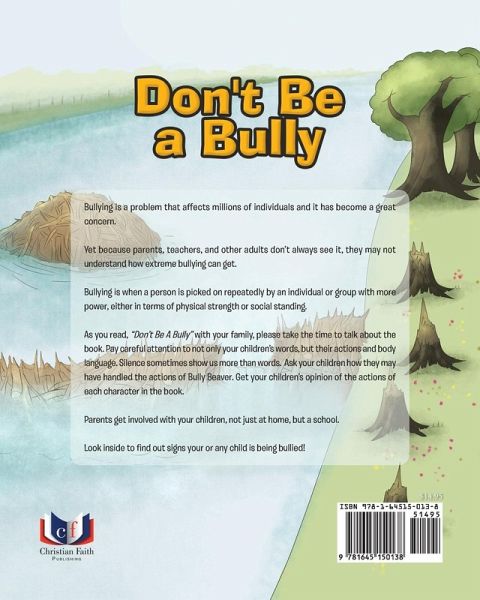 Bullying is a problem that affects millions of individuals and it has become a great concern. Yet because parents, teachers, and other adults don't always see it, they may not understand how extreme bullying can get. Bullying is when a person is picked on repeatedly by an individual or group with more power, either in terms of physical strength or social standing. As you read, " Don't Be A Bully" with your family, please take the time to talk about the book. Pay careful attention to not only your children's words, but their actions and body language. Silence sometimes show us more than words. Ask your children how they may have handled the actions of Bully Beaver. Get your children's opinion of the actions of each character in the book. Parents get involved with your children, not just at home, but a school. Look inside to find out signs your or any child is being bullied!