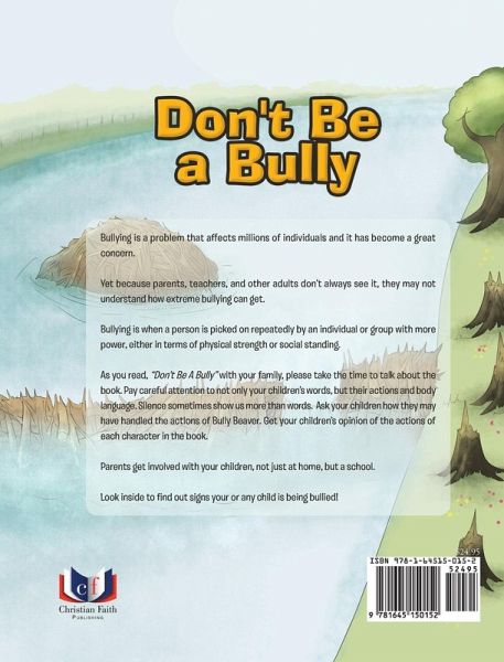Bullying is a problem that affects millions of individuals and it has become a great concern. Yet because parents, teachers, and other adults don't always see it, they may not understand how extreme bullying can get. Bullying is when a person is picked on repeatedly by an individual or group with more power, either in terms of physical strength or social standing. As you read, " Don't Be A Bully" with your family, please take the time to talk about the book. Pay careful attention to not only your children's words, but their actions and body language. Silence sometimes show us more than words. Ask your children how they may have handled the actions of Bully Beaver. Get your children's opinion of the actions of each character in the book. Parents get involved with your children, not just at home, but a school. Look inside to find out signs your or any child is being bullied!