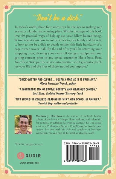 "Don't be a dick." In today's world, these four words can be the key to making our existence a kinder, more loving place. Within the pages of this book lives 69 practical ways of helping out your fellow human being. Between advice on how to not be a dick to your family and friends, to how to not be a dick to people online, this little hurricane of a page turner covers it all. By the end of it, you'll be returning your shopping carts, cleaning your sweat off the gym equipment, and getting consent prior to any sexual encounter like a boss. Read Don't Be a Dick, put the advice into practice, and I guarantee you'll see your life and the lives of those around you improve.* (*Results not guaranteed.)