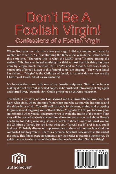 The Title of the book is "Don't Be a Foolish Virgin!" The sub-title is "Confessions of a Foolish Virgin." When God gave me this title a few years ago, I did not understand what he wanted me to write. As I was studying the Bible a few years later, I came across this scripture, "Therefore this is what the LORD says: "Inquire among the nations: Who has ever heard anything like this? A most horrible thing has been done by Virgin Israel. Jeremiah 18:13 (NIV) and in Amos 5:1-2a says, Listen, you people of Israel! Listen to this funeral song I am singing: "The virgin Israel has fallen... "Virgin" is the Children of Israel, in current day we too are the Children of Israel. All of us are included. My Introduction starts with one of my favorite scriptures, "But the jar he was making did not turn out as he had hoped, so he crushed it into a lump of clay again and started over. Jeremiah 18:4. God is giving me an extreme makeover. This book is my story of how God showed me his unconditional love. You will learn what sin is, where sin came from, when and why we sin, who has sinned and the side-effects of sin. You will walk through forgiveness, asking and accepting forgiveness, and forgiving yourself and others. My goal is to help you focus on your state of mind when you fall and prepare you to avoid the attacks of the enemy. Your eyes will be opened to God's unconditional love for you as you read about Hosea's obedience to God by marrying Gomer, a harlot, to show his unconditional love for the Children of Israel. Do you know what your "special needs" are? If not, you'll find out. I'll briefly discuss our opportunities to share with others how God has comforted and forgiven us. There is a personal Spiritual Assessment at the end of the book. This fifteen page assessment is for the reader to examine themselves. To guide them as to what areas of their lives that needs attention. God is waiting!