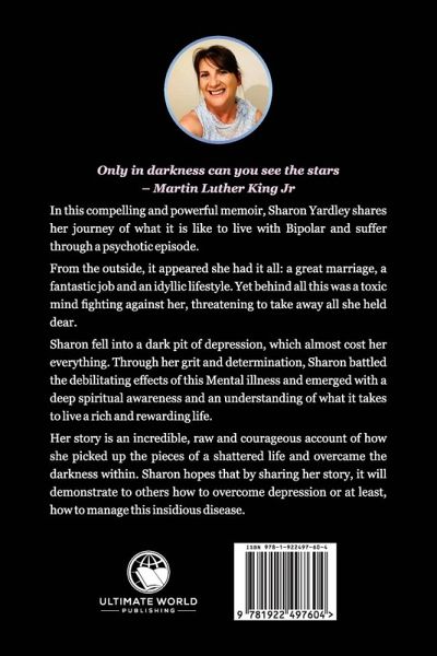 Only in darkness can you see the stars - Martin Luther King Jr In this compelling and powerful memoir, Sharon Yardley shares her journey of what it is like to live with Bipolar and suffer through a psychotic episode. From the outside, it appeared she had it all, a great marriage, a fantastic job and an idyllic lifestyle. Yet behind all this was a toxic mind fighting against her, threatening to take away all she held dear. Sharon fell into a dark pit of depression, which almost cost her everything. Through her grit and determination, Sharon battled the debilitating effects of this Mental Illness and emerged with a deep Spiritual awareness and an understanding of what it takes to live a rich and rewarding life. Her story is an incredible, raw and courageous account of how she picked up the pieces of a shattered life and overcome the darkness within. Sharon hopes that by sharing her story, it will demonstrate to others how to overcome depression or at least, how to manage this insidious disease.