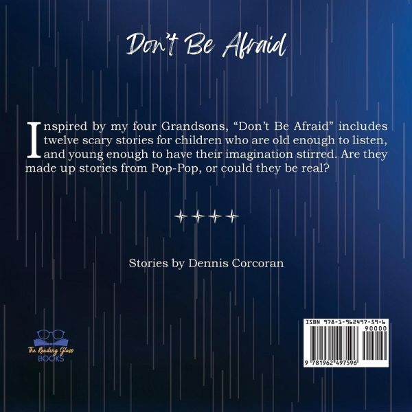 Synopsis: Inspired by my four Grandsons, "Don't Be Afraid" includes twelve scary stories for children who are old enough to listen, and young enough to have their imagination stirred. Are they made up stories from Pop-Pop, or could they be real?