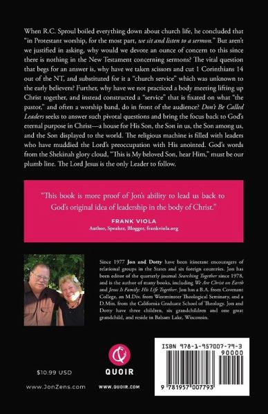 When R.C. Sproul boiled everything down about church life, he concluded that "in Protestant worship, for the most part, we sit and listen to a sermon." But aren't we justified in asking, why would we devote an ounce of concern to this since there is nothing in the New Testament concerning sermons? The vital question that begs for an answer is, why have we taken scissors and cut 1 Corinthians 14 out of the NT, and substituted for it a "church service" which was unknown to the early believers? Further, why have we not practiced a body meeting lifting up Christ together, and instead constructed a "service" that is fixated on what "the pastor," and often a worship band, do in front of the audience? Don't Be Called Leaders seeks to answer such pivotal questions and bring the focus back to God's eternal purpose in Christ-a house for His Son, the Son in us, the Son among us, and the Son displayed to the world. The religious machine is called with leaders who have muddied the Lord's preoccupation with His anointed. God's words from the Shekinah glory cloud, "This is My beloved Son, hear Him," must be our plumb line. The Lord Jesus is the only Leader to follow.