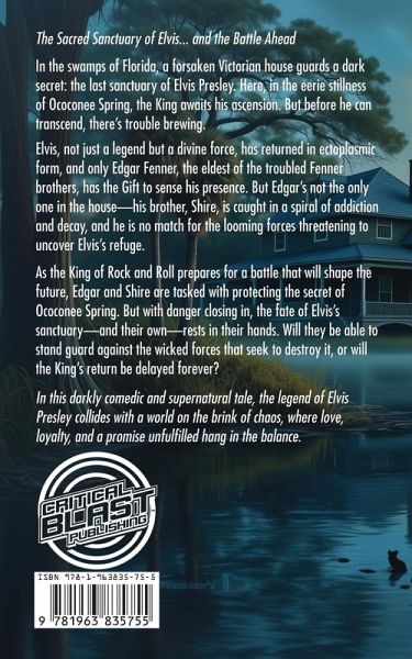 In the swamps of Florida, a forsaken Victorian house guards a dark secret: the last sanctuary of Elvis Presley. Here, in the eerie stillness of Ococonee Spring, the King awaits his ascension. But before he can transcend, there's trouble brewing. Elvis, not just a legend but a divine force, has returned in ectoplasmic form, and only Edgar Fenner, the eldest of the troubled Fenner brothers, has the Gift to sense his presence. In this darkly comedic and supernatural tale, the legend of Elvis Presley collides with a world on the brink of chaos, where love, loyalty, and a promise unfulfilled hang in the balance.