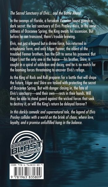 In the swamps of Florida, a forsaken Victorian house guards a dark secret: the last sanctuary of Elvis Presley. Here, in the eerie stillness of Ococonee Spring, the King awaits his ascension. But before he can transcend, there's trouble brewing. Elvis, not just a legend but a divine force, has returned in ectoplasmic form, and only Edgar Fenner, the eldest of the troubled Fenner brothers, has the Gift to sense his presence. In this darkly comedic and supernatural tale, the legend of Elvis Presley collides with a world on the brink of chaos, where love, loyalty, and a promise unfulfilled hang in the balance.