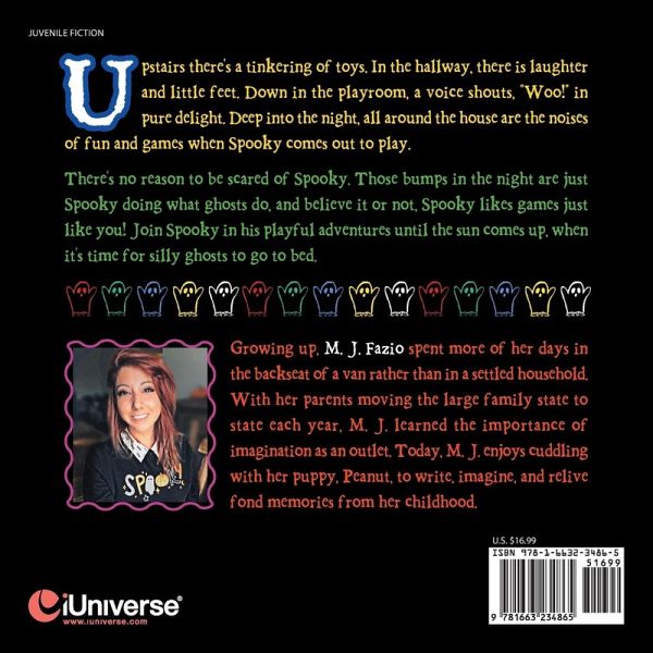 Upstairs there's a tinkering of toys. In the hallway, there is laughter and little feet. Down in the playroom, a voice shouts, "Woo!" in pure delight. Deep into the night, all around the house are the noises of fun and games when Spooky comes out to play. There's no reason to be scared of Spooky. Those bumps in the night are just Spooky doing what ghosts do, and believe it or not, Spooky likes games just like you! Join Spooky in his playful adventures until the sun comes up, when it's time for silly ghosts to go to bed.