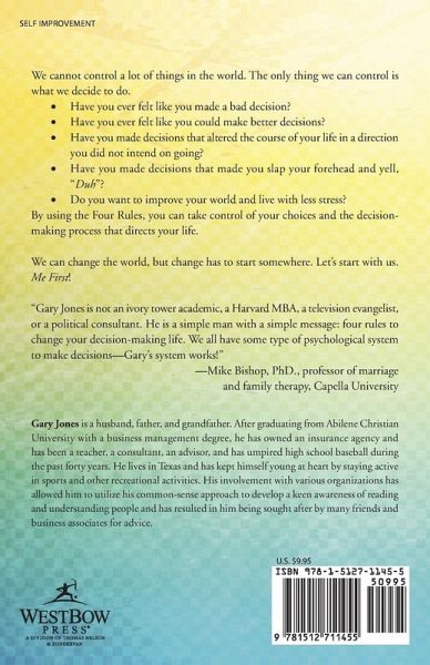 We cannot control a lot of things in the world. The only thing we can control is what we decide to do. Have you ever felt like you made a bad decision? Have you ever felt like you could make better decisions? Have you made decisions that altered the course of your life in a direction you did not intend on going? Have you made decisions that made you slap your forehead and yell, "Duh"? Do you want to improve your world and live with less stress? By using the Four Rules, you can take control of your choices and the decision-making process that directs your life. We can change the world, but change has to start somewhere. Let's start with us. Me First! "Gary Jones is not an ivory tower academic, a Harvard MBA, a television evangelist, or a political consultant. He is a simple man with a simple message: four rules to change your decision-making life. We all have some type of psychological system to make decisions-Gary's system works!" -Mike Bishop, PhD., professor of marriage and family therapy, Capella University