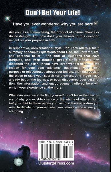 Have you ever wondered why you are here? Are you, as a human being, the product of cosmic chance or divine design? And how does your answer to this question impact on your purpose in life? In supportive, conversational style, Jon Ford offers a lucid summary of complex questions about God, the universe, life, and personal belief ¿ the kind of questions that have intrigued, and often troubled, people since mankind first inhabited the earth. If you have ever wondered about the reason for your own existence, questioned your life's purpose or felt confused about your beliefs, then this book is the place to start your search for answers. And if you have already begun the journey, or even discovered your destination, the information and encouragement offered here will enrich your experience all the more. Wherever you currently find yourself, don't leave the discovery of why you exist to chance or the whims of others. Don't bet your life! In these pages you will find the inspiration you need to decide for yourself what you believe. and where you are going.