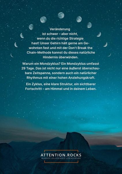 Veränderung ist schwer - aber nicht, wenn du die richtige Strategie hast! Unser Gehirn hält gerne am Gewohnten fest und mit der "Don't Break the Chain-Methode" kannst du dieses natürliche Hindernis überwinden. Warum ein Mondzyklus? Ein Mondzyklus umfasst 29 Tage. Das ist nicht nur eine äußerst überschaubare Zeitspanne, sondern auch ein natürlicher Rhythmus mit einer hohen Anziehungskraft. Ein Zyklus, eine klare Struktur, ein sichtbarer Fortschritt - am Himmel und in deinem Leben.