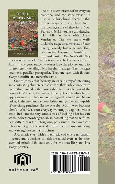 ABOUT THE BOOK The title is reminiscent of an everyday credence. The story expands it into a philosophical doctrine that love is always better than hate. Amidst this conflagration of theories is born Nora Febles, the jovial young school teacher who falls in love with Adam Vandersten. The two meet while under the tragic circumstances of each having recently lost a parent. Their relationship becomes a bushfire of love and passion. But Nora's affability is soon under attack. Sandra Botowy, who had a romance with Adam in the past, suddenly comes into the picture and tries to interfere by sending Nora hateful messages. They take on a peculiar protagonist. They are sent with flowers, always beautiful and never the same. One might say that the story presents an array of interesting and contrasting characters that seem to flawlessly connect with each other, probably the most subtle but notable trait of the novel. Nora's friend, Eva Sulles, is the cynical school teacher, in all fours with her best and congenial friend. Tom, Nora's father, is the modern virtuous father and gentleman, capable of exercising prudence like no one else. Adam, who becomes Nora's husband, is your everyday working young man who is catapulted into the very serious task of looking after his wife when she becomes dangerously ill, a task that he performs with flying colors. Sara is the unforgiving possessive lover who refuses to let go but who is after all capable of understanding and waiving onto happiness. A dramatic story with a traumatic end where no passion is spared and questions of faith are arisen even in the most skeptical minds. Life ends only for the unwilling and love always prevails.