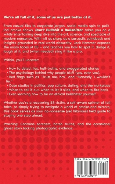 Nonsense is everywhere: at work, online, and during family dinners. We scroll past it, sit through it, and sometimes dish it out ourselves - yet, half the time, we don't even realize it. In Don't Bullshit a Bullshitter, Jack Hammer presents a laugh-out-loud, no-holds-barred survival guide for navigating a world filled with half-truths, hype, and absurd claims. This book equips you with real-life examples, sharp wit, and innovative strategies to decode BS in every form - from subtle white lies to outright scams. You will learn how to: Identify common BS phrases such as "Trust me, bro" and "Honestly, I wouldn't lie." Identify the signs of someone who deceives before they waste your time. Navigate through the absurdities of the office, influencer deceptions, and political posturing. Determine when to confront it, when to ignore it, and when to outsmart it for fun. Be a charming and ethical conversationalist when the moment demands it. Whether you are a skeptic, a storyteller, or weary of people fabricating facts, this book serves as your hilarious and insightful toolkit for remaining grounded in a world that rarely does. It's ideal for fans of humor, psychology, and pop culture, as well as anyone who has ever rolled their eyes during a meeting. Warning: This may cause spontaneous laughter, raised eyebrows, and an increased personal BS radar.