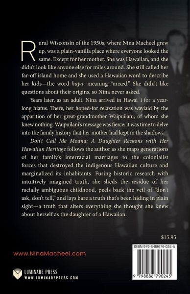 Rural Wisconsin of the 1950s, where Nina Macheel grew up, was a plain-vanilla place where everyone looked the same. Except for her mother. She was Hawaiian, and she didn't look like anyone else for miles around. She still called her far-off island home and she used a Hawaiian word to describe her kids-the word hapa, meaning "mixed." She didn't like questions about their origins, so Nina never asked Years later, as an adult, Nina arrived in Hawai¿i for a year-long hiatus. There, her hoped-for relaxation was waylaid by the apparition of her great-grandmother Waipuilani, of whom she knew nothing. Waipuilani's message was fierce: It was time to delve into the family history that her mother had kept in the shadows. Don't Call Me Moana: A Daughter Reckons with Her Hawaiian Heritage follows the author as she maps generations of her family's interracial marriages to the colonialist forces that destroyed the indigenous Hawaiian culture and marginalized its inhabitants. Fusing historic research with intuitively imagined truth, she sheds the residue of her racially ambiguous childhood, peels back the veil of "don't ask, don't tell," and lays bare a truth that's been hiding in plain sight-a truth that alters everything she thought she knew about herself as the daughter of a Hawaiian.