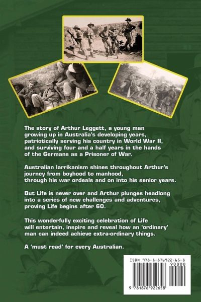 The story of Arthur Leggett, a young man growing up in Australia's developing years, patriotically serving his country in World War II, and surviving four and a half years in the hands of the Germans as a Prisoner of War. Australian larrikanism shines throughout Arthur's journey from boyhood to manhood, through his war ordeals and on into his senior years. But Life is never over and Arthur plunges headlong into a series of new challenges and adventures, proving Life begins after 60. This wonderfully exciting celebration of Life will entertain, inspire and reveal how an 'ordinary' man can indeed achieve extra-ordinary things.