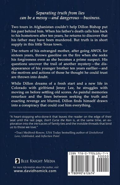 Dillon Bishop survived Afghanistan-but coming home might kill him. Two tours couldn't bury his ghosts. Now, the death of his father drags him back to a Texas town he swore he'd never set foot in again-a place where the truth is a moving target, and everyone's got something to hide. As Dillon struggles to uncover the truth about his father's death, his estranged mother resurfaces after having walked out sixteen years ago. Her timing couldn't be worse. She begs for forgiveness even as she becomes a prime suspect. But the past won't stay buried, and Dillon's search for answers unearths another unsolved crime. It seems the deeper he digs, the less he can trust the people he once called family and friends. With a new life and a clean slate waiting in Colorado alongside Jenny Lee, the woman who believes in him, Dillon is torn between walking away and settling old scores. But in a town built on secrets, the line between justice and revenge is razor thin-and crossing it might cost him his life.