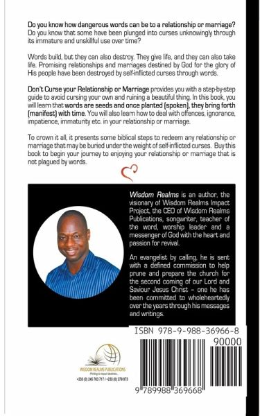 Do you know how dangerous words can be to a relationship or marriage? Do you know that some have been plunged into curses unknowingly through its immature and unskillful use over time? Words build, but they can also destroy. They give life, and they can also take life. Promising relationships and marriages destined by God for the glory of His people have been destroyed by self-inflicted curses through words. Don't Curse your Relationship or Marriage provides you with a step-by-step guide to avoid cursing your own and ruining a beautiful thing. In this book, you will learn that words are seeds and once planted (spoken), they bring forth (manifest) with time. You will also learn how to deal with offences, ignorance, impatience, immaturity etc. in your relationship or marriage. To crown it all, it presents some biblical steps to redeem any relationship or marriage that may be buried under the weight of self-inflicted curses. Buy this book to begin your journey to enjoying your relationship or marriage that is not plagued by words.