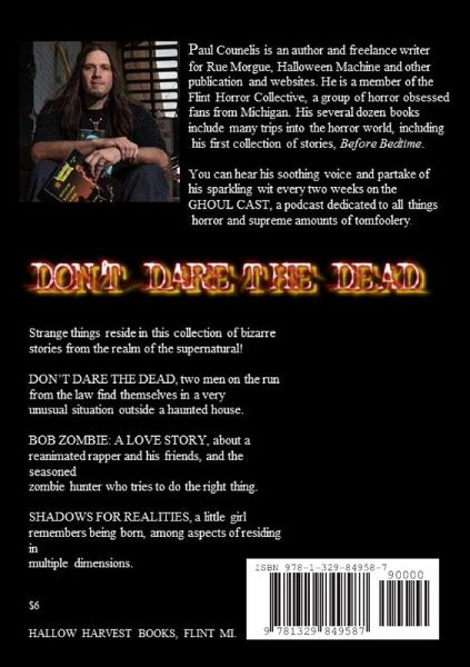 Strange things reside within the pages of this collection of bizarre stories from the realm of the supernatural by author and Rue Morgue columnist PAUL COUNELIS. DON'T DARE THE DEAD, two men on the run from the law find themselves in a very unusual situation outside a haunted house. BOB ZOMBIE: A LOVE STORY, about a reanimated rapper and his friends, and the seasoned zombie hunter who tries to do the right thing. SHADOWS FOR REALITIES, a little girl remembers being born, and the eyes watching her from multiple dimensions. Cover photo: MATT WOODBURY Cover model" SCOTT GRAUBNER