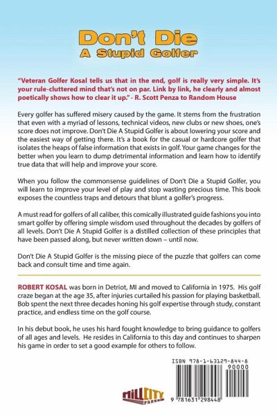 "Veteran Golfer Kosal tells us that in the end, golf is really very simple. It's your rule-cluttered mind that's not on par. Link by link, he clearly and almost poetically shows how to clear it up." - R. Scott Penza to Random House Every golfer has suffered misery caused by the game. It stems from the frustration that even with a myriad of lessons, technical videos, new clubs or new shoes, one's score does not improve. Don't Die A Stupid Golfer is about lowering your score and the easiest way of getting there. It's a book for the casual or hardcore golfer that isolates the heaps of false information that exists in golf. Your game changes for the better when you learn to dump detrimental information and learn how to identify true data that will help and improve your score. When you follow the commonsense guidelines of Don't Die a Stupid Golfer, you will learn to improve your level of play and stop wasting precious time. This book exposes the countless traps and detours that blunt a golfer's progress. A must read for golfers of all caliber, this comically illustrated guide fashions you into smart golfer by offering simple wisdom used throughout the decades by golfers of all levels. Don't Die A Stupid Golfer is a distilled collection of these principles that have been passed along, but never written down - until now. Don't Die A Stupid Golfer is the missing piece of the puzzle that golfers can come back and consult time and time again. Robert Kosal was born in Detriot, MI and moved to California in 1975. His golf craze began at the age 35, after injuries curtailed his passion for playing basketball. Bob spent the next three decades honing his golf expertise through study, constant practice, and endless time on the golf course. In his debut book, he uses his hard fought knowledge to bring guidance to golfers of all ages and levels. He resides in California to this day and continues to sharpen his game in order to set a good example for others to follow.