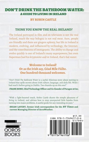 Think you know the real Ireland? The Ireland of portrayed in film and on television is not the real Ireland, much the way bologna is not real meat. Sure, people are friendly and there are gingers aplenty, but life in Ireland is modern, evolving, and influenced by technology, the Internet, and the contributions of immigrants. The ability to change and evolve quickly is one of Ireland's many superpowers, but even Superman had his kryptonite and in Ireland, that's hot water. In Don't Drink the Bathroom Water, you get:The difference between Gaelic, Gaeilge, and Gammon. Sage advice for navigating Ireland, both roads and beaurocracy. You'll learn that in Ireland, smoking a joint and good craic are not drug related. Fascinating details about Irish homes, their quirks and features, and what you can expect. Exciting news about recent developments in Irish transportation. The differences between Northern Ireland and the Republic of Ireland Concise explanations regarding education in Ireland, primary thru university An explanation of V.A.T., which does not stand for very angsty teen but rather value added tax. Informative profiles of areas outside County Dublin. Easy to understand guidance on costs and the economy of Ireland Welcome to Ireland! Or as the Irish say, Céad Míle Fáilte. One hundred thousand welcomes. "With a light-hearted touch, Robin Castle shares the simple pleasures of living in Ireland, and advises how to stop unexpected little hassles from turning into major problems. A useful guide for any intending ex-pats." -- Brian Lavery, former Irish correspondent for the NY Times and current Managing Director of AccuWeather.