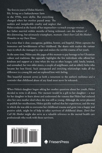 The first six years of Helen Martin's life, living on a Saskatchewan farm in the 1950s, were idyllic. But everything changed when her mother passed away. The sudden and inexplicable cruelty and neglect that Helen endured at the hands of her stepmother-a much younger woman her father married within months of being widowed-are the subject of this distressing, but ultimately triumphant, memoir: Don't Ever Call Me Mother: Homeless in my Own Home. In a voice that is clear, courageous, guileless, honest, and hopeful, Helen captures the innocence and bewilderment of her childhood. She shares with readers the various ways in which she managed to cope and endure the terrible trauma of her youth. At the same time, Helen uses the pages of this memoir to pay homage to her Ukrainian culture and traditions. She especially highlights the few individuals who offered her kindness and support at a time when she was so often hungry, cold, lonely, bruised, and unwashed: her two older sisters, a couple of neighbours, and an elderly hobo who became her best friend. Such unexpected and enriching relationships make all the difference in a young life and are explored here with feeling. This beautiful memoir serves as both a testament to the author's resilience and a reminder that childhood abuse of any kind must never be tolerated.