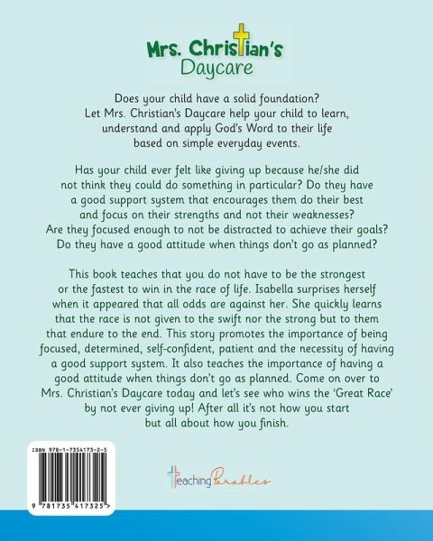 Has your child ever felt like giving up because he/she did not think that they could do something in particular? Do they have a good support system that encourages them do their best and focus on their strengths and not their weaknesses? Are they focused enough to not be distracted to achieve their goals? Do they have a good attitude when things don't go as planned? This book teaches that you do not have to be the strongest or the fastest to win in the race of life. Isabella surprises herself when it appeared that all odds are against her. She quickly learns that the race is not given to the swift nor the strong but to them that endure to the end. This story promotes the importance of being focused, determined, self-confident, patient and the necessity of having a good support system. It also teaches the importance of having a good attitude when things don't go as planned. Come on over to Mrs. Christian Daycare today and lets' see who wins the 'Great Race' by not ever giving up! After all it's not how you start but all about how you finish.