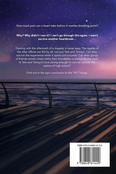 How much pain can a heart take before it reaches breaking point? Why? Why didn't I see it? I can't go through this again. I won't survive another heartbreak... Dealing with the aftermath of a tragedy is never easy. The ripples of the after effects are felt by all, not just Tate and Tamsyn. Can they survive the experience while it opens old wounds? Can their group of friends remain intact while their foundation is shaken to the core? Is Tate and Tamsyn's love strong enough to survive outside the realms of high school? Find out in the epic conclusion to the TNT Trilogy.