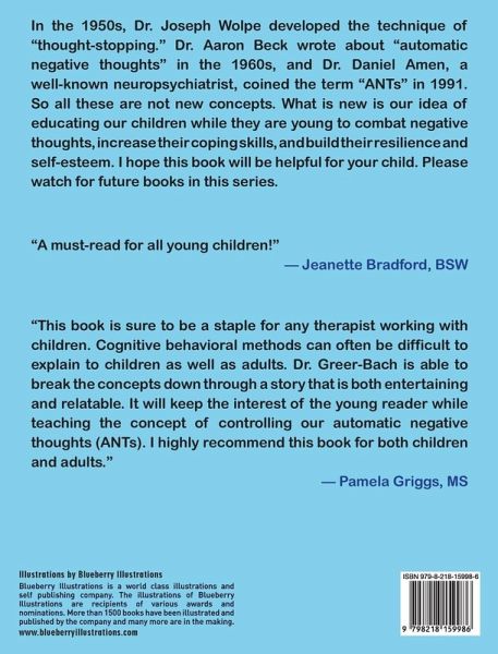Don't Feed The Ants is a children's book, ages 5 to 10, to help children identify, stop, and change automatic negative thoughts by using a process called "thought-stopping". This book depicts a little boy who feels sad, has negative thoughts about himself, and may have depression. He does not want to join his friends in soccer. An analogy of ANTs (Automatic Negative Thoughts) and the insects "ANTs" is used in describing how ANTs multiply if we "feed" them. The little boy's mother talks with her son about his sadness and how to change the negative thoughts to positive thoughts, instead of "feeding" the ANTs, causing them to multiply. Instead, she teaches him how to catch, stop, and change the automatic negative thoughts to positive thoughts, so he can control the negative thoughts and/or depressive thoughts, and feel happy again. It is important that we teach our children these coping mechanisms early in life, so they can learn to identify and manage their emotions, thereby increasing their resilience in life. If children allow these automatic negative thoughts to control them, they may end up being negative and depressed adults. Any techniques we can teach our children will only benefit them as they grow into teens and then adults.