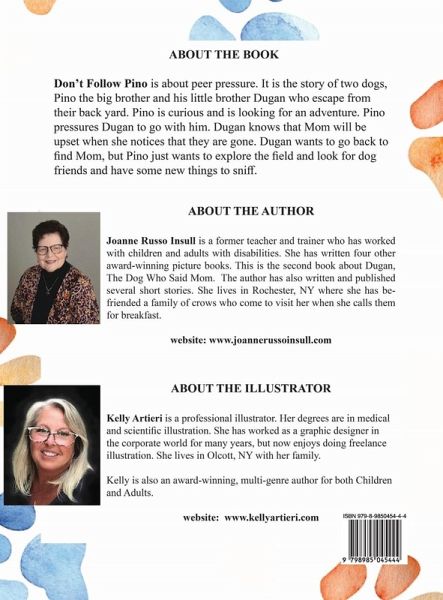 Don't Follow Pino! is about peer pressure. It is the story of two dogs, Pino the big brother and his little brother Dugan who escape from their back yard. Pino is curious and is looking for an adventure. Pino pressures Dugan to go with him. Dugan knows that Mom will be upset when she notices that they are gone. Dugan wants to go back to find Mom, but Pino just wants to explore the field and look for dog friends and have some new things to sniff.