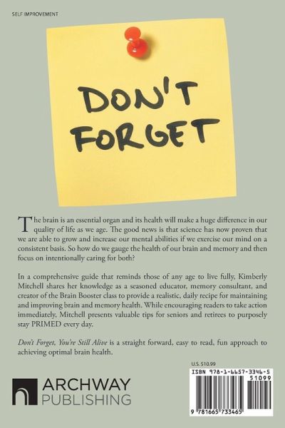 The brain is an essential organ and its health will make a huge difference in our quality of life as we age. The good news is that science has now proven that we are able to grow and increase our mental abilities if we exercise our mind on a consistent basis. So how do we gauge the health of our brain and memory and then focus on intentionally caring for both? In a comprehensive guide that reminds those of any age to live fully, Kimberly Mitchell shares her knowledge as a seasoned educator, memory consultant, and creator of the Brain Booster class to provide a realistic, daily recipe for maintaining and improving brain and memory health. While encouraging readers to take action immediately, Mitchell presents valuable tips for seniors and retirees to purposely stay PRIMED every day. Don't Forget, You're Still Alive is a straight forward, easy to read, fun approach to achieving optimal brain health.