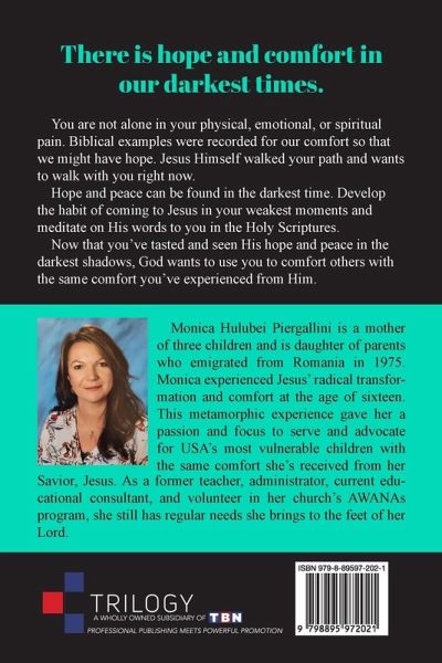 There is hope and comfort in our darkest times. You are not alone in your physical, emotional, or spiritual pain. Biblical examples were recorded for our comfort so that we might have hope. Jesus Himself walked your path and wants to walk with you right now. Hope and peace can be found in the darkest time. Develop the habit of coming to Jesus in your weakest moments and meditate on His words to you in the Holy Scriptures. Now that you've tasted and seen His hope and peace in the darkest shadows, God wants to use you to comfort others with the same comfort you've experienced from Him.
