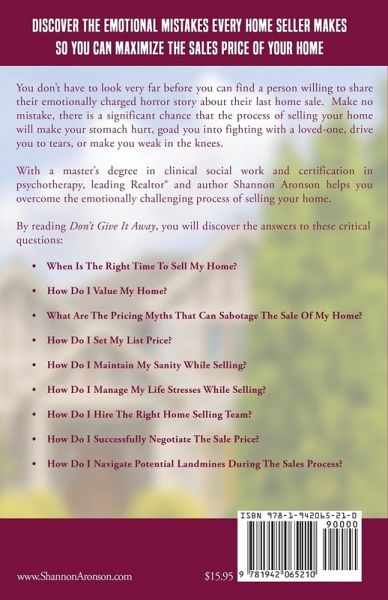Discover The Emotional Mistakes Every Home Seller Makes So You Can Maximize The Sales Price Of Your Home You don’t have to look very far before you can find a person willing to share their emotionally charged horror story about their last home sale. Make no mistake, there is a significant chance that the process of selling your home will make your stomach hurt, goad you into fighting with a loved-one, drive you to tears, or make you weak in the knees. With a master’s degree in clinical social work and certification in psychotherapy, leading Realtor® and author Shannon Aronson helps you overcome the emotionally challenging process of selling your home. By reading Don’t Give It Away, you will discover the answers to these critical questions: • When Is The Right Time To Sell My Home? • How Do I Value My Home? • What Are The Pricing Myths That Can Sabotage The Sale Of My Home? • How Do I Set My List Price? • How Do I Maintain My Sanity While Selling? • How Do I Manage My Life Stresses While Selling? • How Do I Hire The Right Home Selling Team? • How Do I Successfully Negotiate The Sale Price? • How Do I Navigate Potential Landmines During The Sales Process? To learn more, please visit www.ShannonAronson.com.