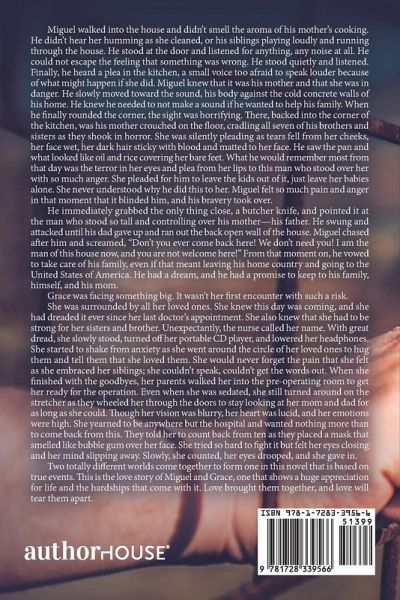 Miguel walked into the house and didn't smell the aroma of his mother's cooking. He didn't hear her humming as she cleaned, or his siblings playing loudly and running through the house. He stood at the door and listened for anything, any noise at all. He could not escape the feeling that something was wrong. He stood quietly and listened. Finally, he heard a plea in the kitchen, a small voice too afraid to speak louder because of what might happen if she did. Miguel knew that it was his mother and that she was in danger. He slowly moved toward the sound, his body against the cold concrete walls of his home. He knew he needed to not make a sound if he wanted to help his family. When he finally rounded the corner, the sight was horrifying. There, backed into the corner of the kitchen, was his mother crouched on the floor, cradling all seven of his brothers and sisters as they shook in horror. She was silently pleading as tears fell from her cheeks, her face wet, her dark hair sticky with blood and matted to her face. He saw the pan and what looked like oil and rice covering her bare feet. What he would remember most from that day was the terror in her eyes and plea from her lips to this man who stood over her with so much anger. She pleaded for him to leave the kids out of it, just leave her babies alone. She never understood why he did this to her. Miguel felt so much pain and anger in that moment that it blinded him, and his bravery took over. He immediately grabbed the only thing close, a butcher knife, and pointed it at the man who stood so tall and controlling over his mother-his father. He swung and attacked until his dad gave up and ran out the back open wall of the house. Miguel chased after him and screamed, "Don't you ever come back here! We don't need you! I am the man of this house now, and you are not welcome here!" From that moment on, he vowed to take care of his family, even if that meant leaving his home country and going to the United States of America. He had a dream, and he had a promise to keep to his family, himself, and his mom. Grace was facing something big. It wasn't her first encounter with such a risk. She was surrounded by all her loved ones. She knew this day was coming, and she had dreaded it ever since her last doctor's appointment. She also knew that she had to be strong for her sisters and brother. Unexpectantly, the nurse called her name. With great dread, she slowly stood, turned off her portable CD player, and lowered her headphones. She started to shake from anxiety as she went around the circle of her loved ones to hug them and tell them that she loved them. She would never forget the pain that she felt as she embraced her siblings; she couldn't speak, couldn't get the words out. When she finished with the goodbyes, her parents walked her into the pre-operating room to get her ready for the operation. Even when she was sedated, she still turned around on the stretcher as they wheeled her through the doors to stay looking at her mom and dad for as long as she could. Though her vision was blurry, her heart was lucid, and her emotions were high. She yearned to be anywhere but the hospital and wanted nothing more than to come back from this. They told her to count back from ten as they placed a mask that smelled like bubble gum over her face. She tried so hard to fight it but felt her eyes closing and her mind slipping away. Slowly, she counted, her eyes drooped, and she gave in. Two totally different worlds come together to form one in this novel that is based on true events. This is the love story of Miguel and Grace, one that shows a huge appreciation for life and the hardships that come with it. Love brought them together, and love will tear them apart.
