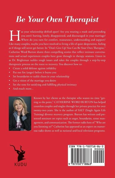 Be Your Own Therapist Has your relationship drifted apart? Are you wearing a mask and pretending you aren't hurting, lonely, disappointed, and discouraged in your marriage? Where do you turn for comfort, reassurance, understanding and support? Like many couples, maybe you have resolved to living a life of quiet desperation, feeling as if things will never get better. In "Don't Give Up! You Can Be Your Own Therapist," Catherine Word Burton shares three compelling stories that reflect intimate conversations and actual experiences couples have gone through in therapy sessions. Listen in as Dr. Brightman tackles tough issues and takes the couples through a step-by-step therapeutic process on the route to recovery. You discover how to:Create a solid defense against infidelity Put out fire (anger) before it burns you Set boundaries to tackle chaos in your relationship Get a vision of the marriage you desire Set the tone for satisfying and fulfilling physical intimacy And much more...