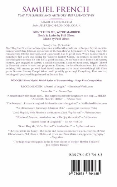 Don't Hug Me, We're Married takes place in a small north woods bar in Bunyan Bay, Minnesota. Gunner and Clara Johnson are owners of the bar, they've been married "a long time," the romance has left the marriage, and Clara would like to get it back. When Gunner finds a pamphlet that Clara was hiding for "Divorce Fantasy Camp," he realizes he needs to do something to convince his wife he's a good husband. At the same time, Bernice, the pretty waitress, gets engaged to Aarvid, a karaoke salesman. Gunner's twin sister, Trigger (played by Gunner) comes to town and proposes to Kanute, the local business icon. It's a double wedding. Will anyone get cold feet? Would someone try to derail the wedding? Will Clara go to Divorce Fantasy Camp? What could possibly go wrong? Everything. Rest assured, nothing will go as wedding-planned in Bunyan Bay.