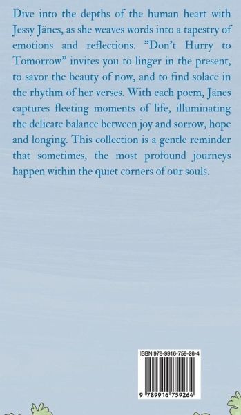 Dive into the depths of the human heart with Jessy Jänes, as she weaves words into a tapestry of emotions and reflections. "Don't Hurry to Tomorrow" invites you to linger in the present, to savor the beauty of now, and to find solace in the rhythm of her verses. With each poem, Jänes captures fleeting moments of life, illuminating the delicate balance between joy and sorrow, hope and longing. This collection is a gentle reminder that sometimes, the most profound journeys happen within the quiet corners of our souls. Copyright © 2024 Book Fairy Publishing