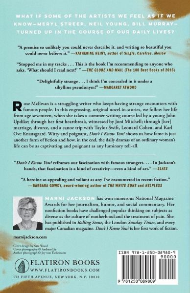 #1 bestseller in Canada: a debut novel-in-stories that follows one woman's life from age 16 to 60, and what happens when certain celebrities start turning up in her private life. What if some of the artists we feel as if we know--Meryl Streep, Neil Young, Bill Murray--turned up in the course of our daily lives? This is what happens to Rose McEwan, an ordinary woman who keeps having strange encounters with famous people. In this engrossing, original novel-in-stories, we follow her life from age 17, when she takes a summer writing course led by a young John Updike, through her first heartbreak (witnessed by Joni Mitchell) on the island of Crete, through her marriage, divorce, and a canoe trip with Taylor Swift, Leonard Cohen and Karl Ove Knausgaard. (Yes, read on.) With wit and insight, Marni Jackson takes a world obsessed with celebrity and turns it on its head. In Don't I Know You?, she shows us how fame is just another form of fiction, and how, in the end, the daily dramas of an ordinary woman's life can be as captivating and poignant as any luminary tell-all.