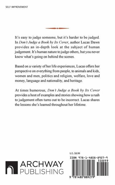 It's easy to judge someone, but it's harder to be judged. In Don't Judge a Book by Its Cover, author Lucas Dawn provides an in-depth look at the subject of human judgement. It's human nature to judge others, but you never know what's going on behind the scenes. Based on a variety of her life experiences, Lucas offers her perspective on everything from people, to animals and kids, women and men, politics and religion, welfare, love and money, language and nationality, and heritage. At times humorous, Don't Judge a Book by Its Cover provides a host of examples and stories showing how a rush to judgement often turns out to be incorrect. Lucas shares the lessons she's learned throughout her lifetime.