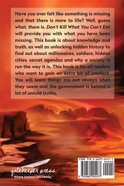 Have you ever felt something was missing? Is there more to this life? Don't Kill What You Can't Eat will reveal the secrets you felt were missing. This book contains hidden knowledge, truths, and history. There are stories about millionaires, soldiers, hidden cities, secret agendas, and why society functions as it does. This book is intended for all readers that wish to gain extra intelligence. It shows that things aren't always what they seem, and the government is behind a lot of untold truths.