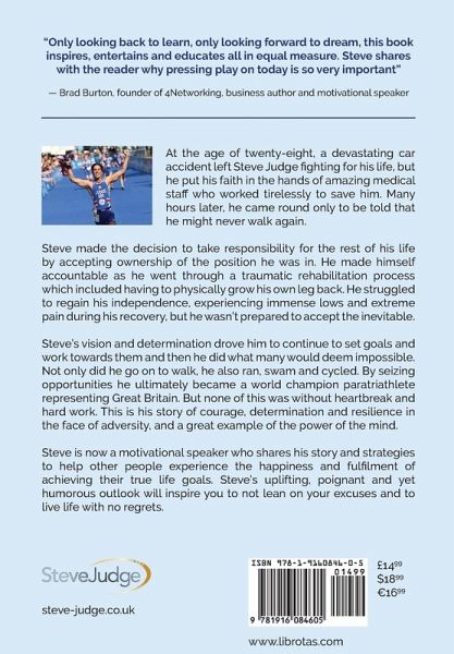At the age of twenty-eight, a devastating car accident left Steve Judge fighting for his life, but he put his faith in the hands of amazing medical staff who worked tirelessly to save him. Many hours later, he came round only to be told that he might never walk again. Steve made the decision to take responsibility for the rest of his life by accepting ownership of the position he was in. He made himself accountable as he went through a traumatic rehabilitation process which included having to physically grow his own leg back. He struggled to regain his independence, experiencing immense lows and extreme pain during his recovery, but he wasn’t prepared to accept the inevitable. Steve’s vision and determination drove him to continue to set goals and work towards them and then he did what many would deem impossible. Not only did he go on to walk, he also ran, swam and cycled. By seizing opportunities he ultimately became a gold medal winning world champion paratriathlete representing Great Britain. But none of this was without heartbreak and hard work. This is his story of courage, determination and resilience in the face of adversity, and a great example of the power of the mind. Steve is now a motivational speaker who shares his story and strategies in his autobiography to help other people experience the happiness and fulfilment of achieving their true life goals. Steve’s uplifting, poignant and yet humorous outlook will inspire you to not lean on your excuses and to live life with no regrets. "Only looking back to learn, only looking forward to dream, this book inspires, entertains and educates all in equal measure. Steve shares with the reader why pressing play on today is so very important." – Brad Burton, founder of 4Networking, business author and motivational speaker