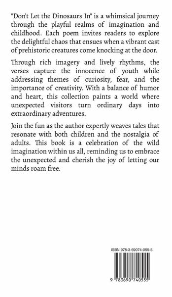 "Don't Let the Dinosaurs In" is a whimsical journey through the playful realms of imagination and childhood. Each poem invites readers to explore the delightful chaos that ensues when a vibrant cast of prehistoric creatures come knocking at the door. Through rich imagery and lively rhythms, the verses capture the innocence of youth while addressing themes of curiosity, fear, and the importance of creativity. With a balance of humor and heart, this collection paints a world where unexpected visitors turn ordinary days into extraordinary adventures. Join the fun as the author expertly weaves tales that resonate with both children and the nostalgia of adults. This book is a celebration of the wild imagination within us all, reminding us to embrace the unexpected and cherish the joy of letting our minds roam free.