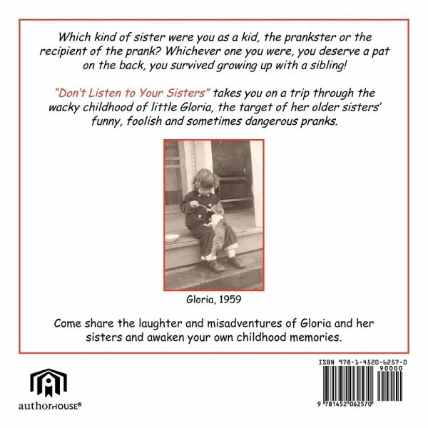 Which kind of sister were you as a kid, the prankster or the recipient of the prank? Whichever one you were, you deserve a pat on the back, you survived growing up with a sibling! "Don't Listen to Your Sisters" takes you on a trip through the wacky childhood of little Gloria, the target of her older sisters' funny, foolish and sometimes dangerous pranks. Come share the laughter and misadventures of Gloria and her sisters and awaken your own childhood memories.