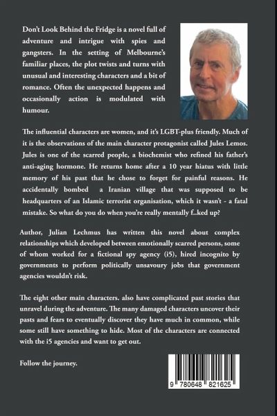 "Don't Look Behind the Fridge" is a novel full of adventure and intrigue with spies and gangsters. In the setting of Melbourne's familiar places, the plot twists and turns with unusual and interesting characters and a bit of romance. Often the unexpected happens and occasionally action is modulated with humour. The influential characters are women, and it's LGBT-plus friendly. Much of it is the observations of the main character protagonist called Jules Lemos, who returns home after a 10-year hiatus with little memory of his past that he chose to forget for painful reasons. He accidentally bombed an headquarters of an Islamic terrorist organization, which it wasn't - a fatal mistake. So, what do you do when you're really mentally f..ked up? Author, Julian Lechmus has written this novel about complex relationships which developed between emotionally scarred persons, some of whom worked for a fictional spy agency (i5), hired incognito by governments to perform politically unsavoury jobs that government agencies wouldn't risk. The eight other main characters. also have complicated past stories that unravel during the adventure. The many damaged characters uncover their pasts and fears to eventually discover they have much in common, while some still have something to hide. Most of the characters are connected with the i5 agencies and want to get out. Follow the journey.