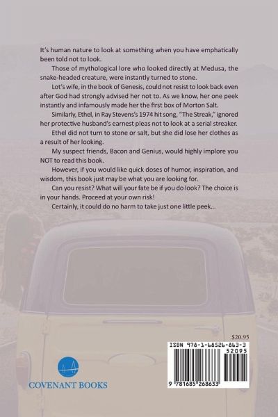 It's human nature to look at something when you have emphatically been told not to look. Those of mythological lore who looked directly at Medusa, the snake-headed creature, were instantly turned to stone. Lot's wife, in the book of Genesis, could not resist to look back even after God had strongly advised her not to. As we know, her one peek instantly and infamously made her the first box of Morton Salt. Similarly, Ethel, in Ray Stevens's 1974 hit song, "The Streak," ignored her protective husband's earnest pleas not to look at a serial streaker. Ethel did not turn to stone or salt, but she did lose her clothes as a result of her looking. My suspect friends, Bacon and Genius, would highly implore you NOT to read this book. However, if you would like quick doses of humor, inspiration, and wisdom, this book just may be what you are looking for. Can you resist? What will your fate be if you do look? The choice is in your hands. Proceed at your own risk! Certainly, it could do no harm to take just one little peek...