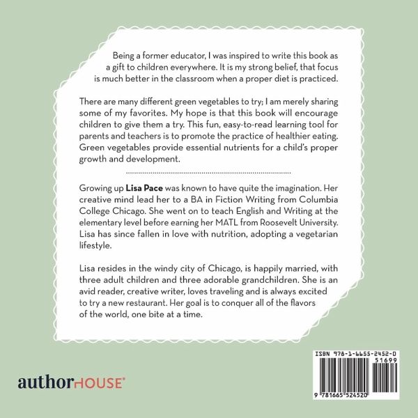 Being a former educator, I was inspired to write this book as a gift to children everywhere. It is my strong belief, that focus is much better in the classroom when a proper diet is practiced. There are many different green vegetables to try; I am merely sharing some of my favorites. My hope is that this book will encourage children to give them a try. This fun, easy-to-read learning tool for parents and teachers is to promote the practice of healthier eating. Green vegetables provide essential nutrients for a child's proper growth and development.