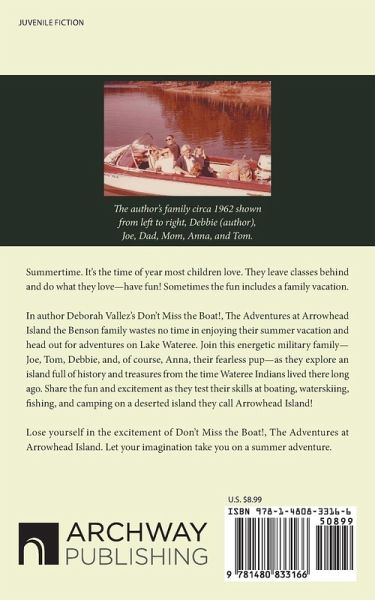 Summertime. It's the time of year most children love. They leave classes behind and do what they love-have fun! Sometimes the fun includes a family vacation. In author Deborah Vallez's Don't Miss the Boat!, The Adventures at Arrowhead Island the Benson family wastes no time in enjoying their summer vacation and head out for adventures on Lake Wateree. Join this energetic military family-Joe, Tom, Debbie, and, of course, Anna, their fearless pup-as they explore an island full of history and treasures from the time Wateree Indians lived there long ago. Share the fun and excitement as they test their skills at boating, waterskiing, fishing, and camping on a deserted island they call Arrowhead Island! Lose yourself in the excitement of Don't Miss the Boat!, The Adventures at Arrowhead Island. Let your imagination take you on a summer adventure.