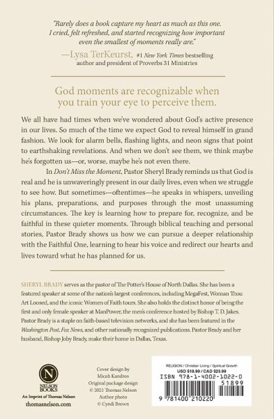 Pastor and popular Bible teacher Sheryl Brady helps Christians prepare for, recognize, and cultivate the powerful yet easily overlooked moments when God shows up in their lives.