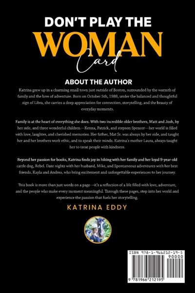 Katrina grew up in a charming small town just outside of Boston, surrounded by the warmth of family and the love of adventure. Born on October 5th, 1988, under the balanced and thoughtful sign of Libra, she carries a deep appreciation for connection, storytelling, and the beauty of everyday moments. Family is at the heart of everything she does. With two incredible older brothers, Matt and Josh, by her side, and three wonderful children-Kenna, Patrick, and stepson Spencer-her world is filled with love, laughter, and cherished memories. Her father, Mat Sr. was always by her side, and taught her and her brothers work ethic, and to speak their minds. Katrina's mother Laura, always taught her to treat people with kindness. Beyond her passion for books, Katrina finds joy in hiking with her family and her loyal 9-year-old cattle dog, Rebel. Date nights with her husband, Mike, and spontaneous adventures with her best friends, Kayla and Andrea, who bring excitement and unforgettable experiences to her journey. This book is more than just words on a page-it's a reflection of a life filled with love, adventure, and the people who make every moment meaningful. Through these pages, step into her world and experience the passion that fuels her storytelling.